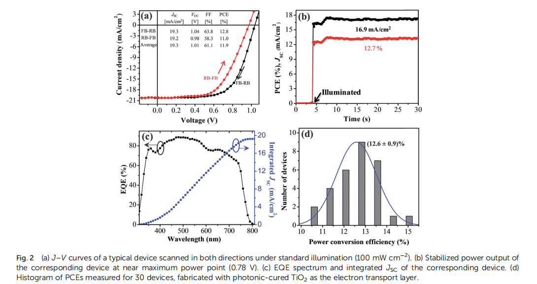 在這項工作中,我們證明了光子固化技術(shù)在氧化銦錫(ITO)涂層玻璃和PET基板上實現(xiàn)高質(zhì)量溶膠-凝膠處理的TiO2薄膜的可行性。此外,還研究了水分對鈣鈦礦薄膜生長和相關(guān)器件性能的影響。在光子固化TiO2層上采用優(yōu)化的鈣鈦礦薄膜生長制造的PSC在玻璃和柔性 PET 基板上的PCE分別高達15.0%11.2%,與迄今為止報道的 PCE 相當(dāng)。